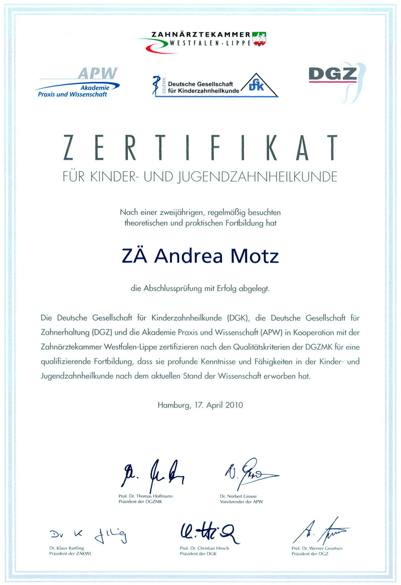 2010 habe ich nach einer zweijährigen theoretischen und praktischen Fortbildung mit abschließender Zertifizierung nach den Richtlinien der DGZMK diesen Schwerpunkt in meiner Praxis etabliert.