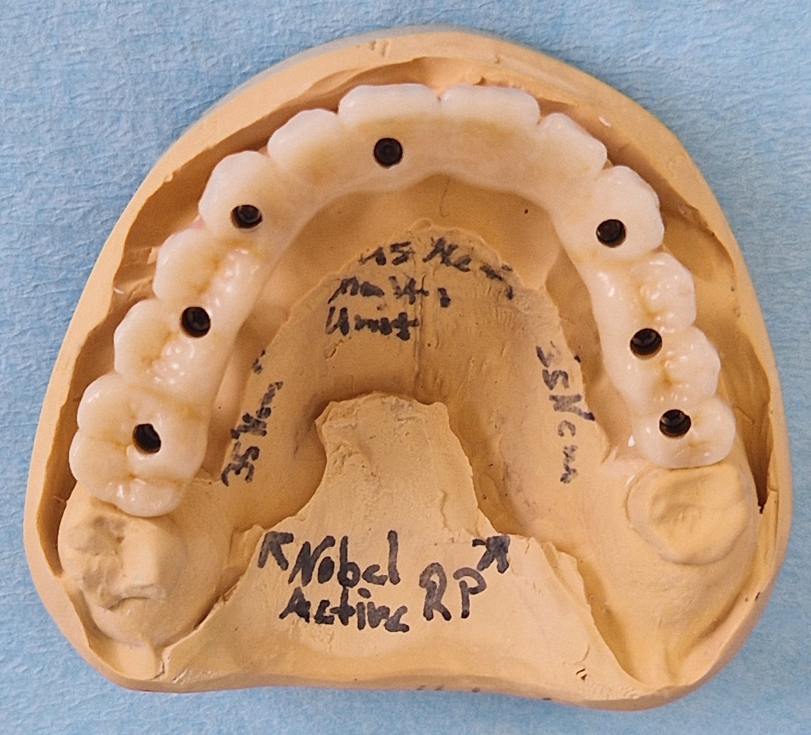 Die schwarzen Löcher werden nach dem Einschrauben der Implantatbrücke mit zahnfarbenen Kunststoff verschlossen